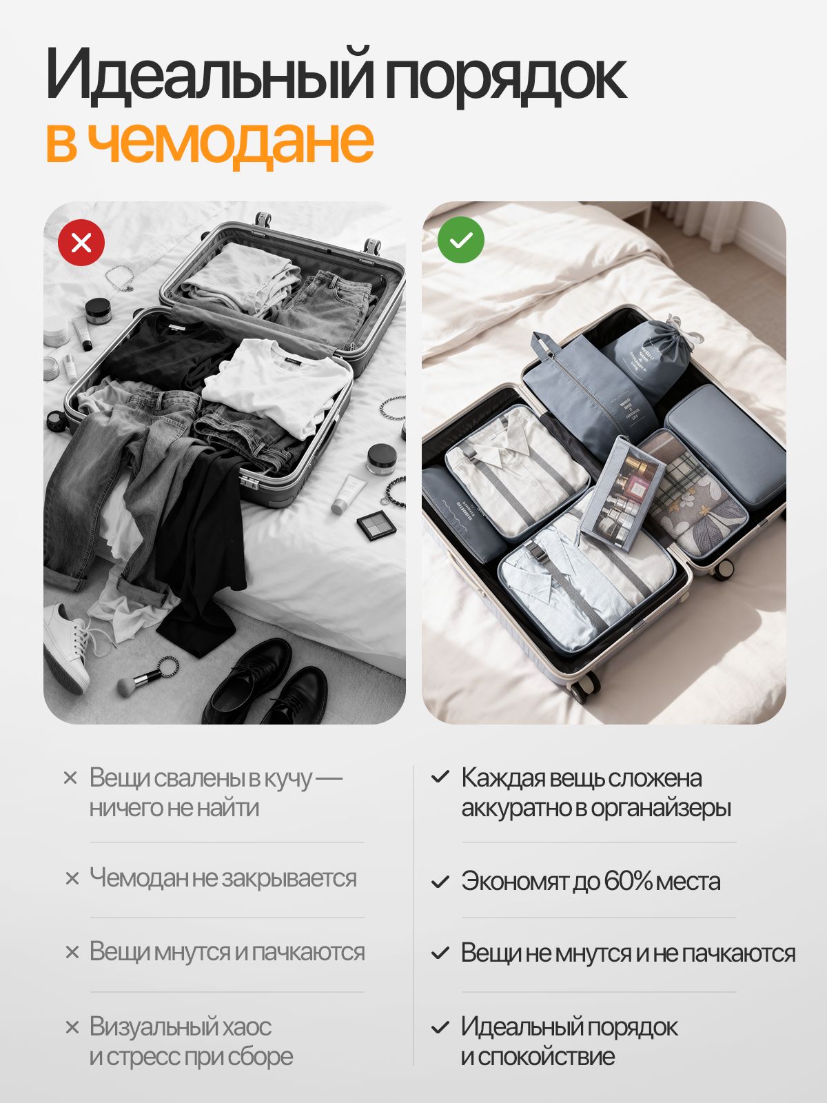 - Экономия места до 60% в чемодане;